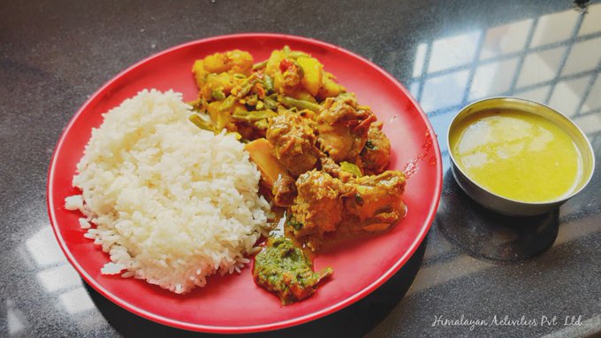 チキンカレー、青唐辛子のアチャール、カトマンズ郊外に住むスタッフ宅で朝採れたというインゲンとジャガイモのおかずにダル。